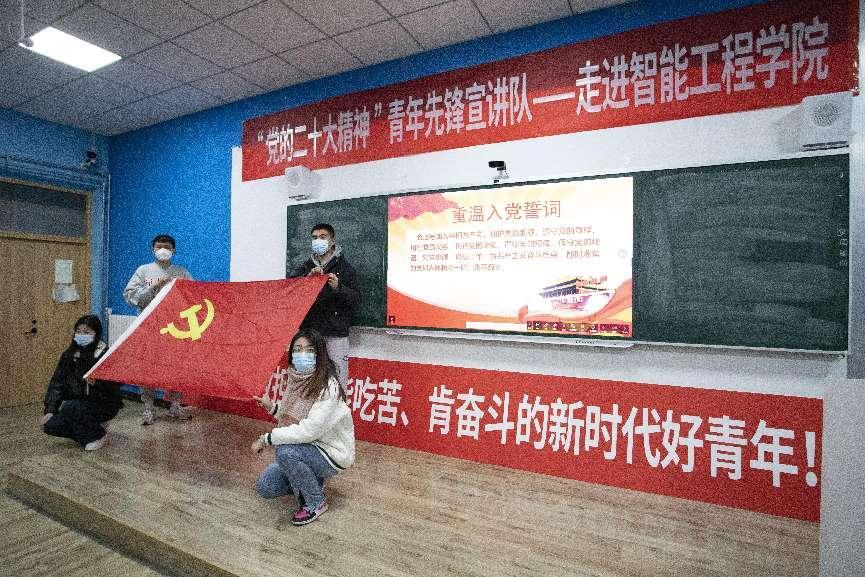 宣讲结束后,在场的师生党员们全体起立,重温入党誓词,进一步坚定了党员们听党话、跟党走,争做先锋模范的决心。现场还组织了“为青春喝彩、为理想奋进”主题涂鸦活动,师生们纷纷拿起画笔,在“做有理想、敢担当、能吃苦、肯奋斗的新时代好青年”涂鸦板上描出色彩,并现场合影留念。智能工程学院相关负责同志号召大家将党的二十大精神落实到行动中去,真正把个人发展、学院发展、学校发展有机融合在一起,做新时代优秀青年。